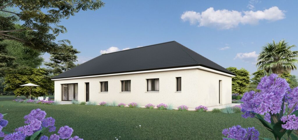Un garage intégré fait partie des prestations de cette maison, apportant une solution de rangement ou de stationnement pratique. Le modèle 2513 séduira les familles à la recherche d’un plain-pied sur mesure, alliant espace, confort et fonctionnalité.