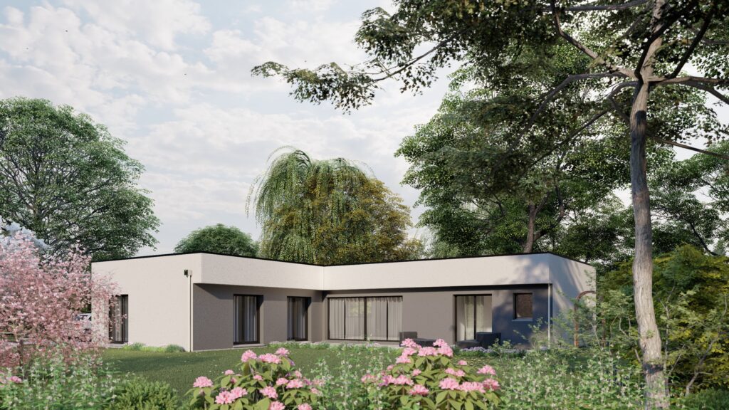 Pensée pour conjuguer confort et générosité des espaces, la maison 2525 développe 164m² habitables sur un seul niveau. Son vaste espace de vie, baigné de lumière naturelle, regroupe un séjour accueillant et une cuisine ouverte, favorisant une atmosphère conviviale et chaleureuse. On peut trouver un cellier attenant au séjour/cuisine et au garage pour plus de solutions de stockage et de rangement.