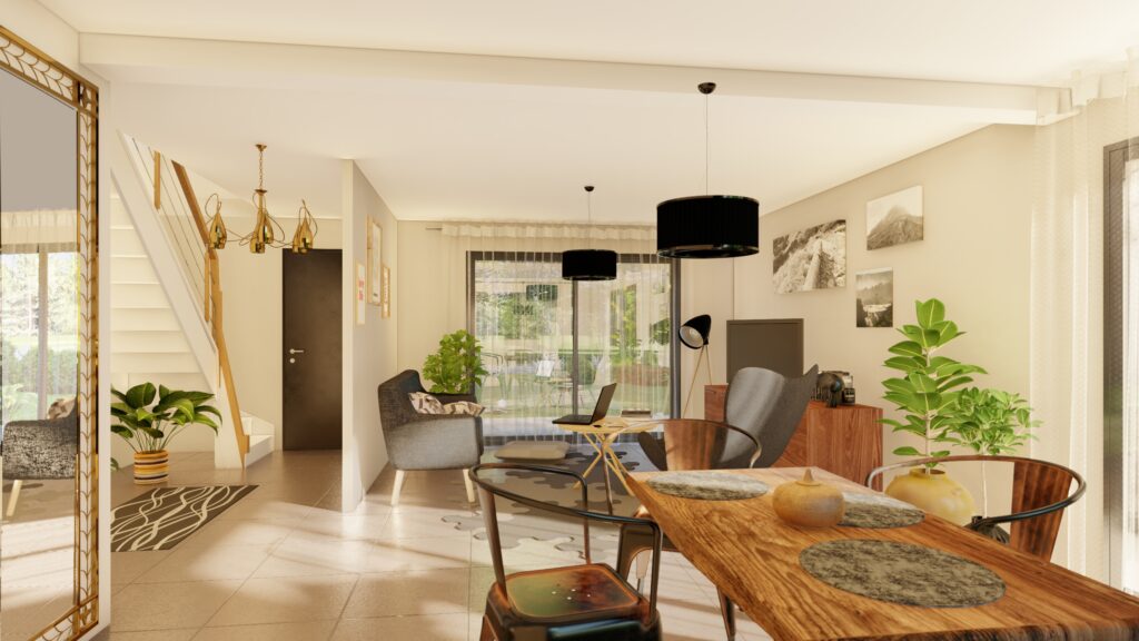 Le modèle 25109 – R+1 propose une maison à étage de 121m² habitables, pensée pour répondre aux besoins d’un foyer à la recherche d’un espace optimisé et confortable. Répartie sur deux niveaux, cette maison offre un agencement clair avec une pièce de vie principale conviviale au rez-de-chaussée, comprenant un séjour-salon ouvert sur une cuisine fonctionnelle. L’espace est conçu pour favoriser la fluidité et la luminosité. Un cellier attenant au séjour-cuisine vient offrir un espace supplémentaire de rangement et de stockage. Ce niveau intègre également une première chambre avec salle d’eau privative, idéale pour un bureau ou une chambre d’amis, ainsi que des WC indépendants. À l’étage, trois chambres supplémentaires permettent d’accueillir les membres du foyer dans des espaces distincts. Une salle de bain bien agencée et des WC séparés complètent ce niveau. Sans garage, cette maison de la gamme Créations sur mesure mise sur la qualité des volumes intérieurs et une répartition intelligente des pièces pour un quotidien agréable et pratique.