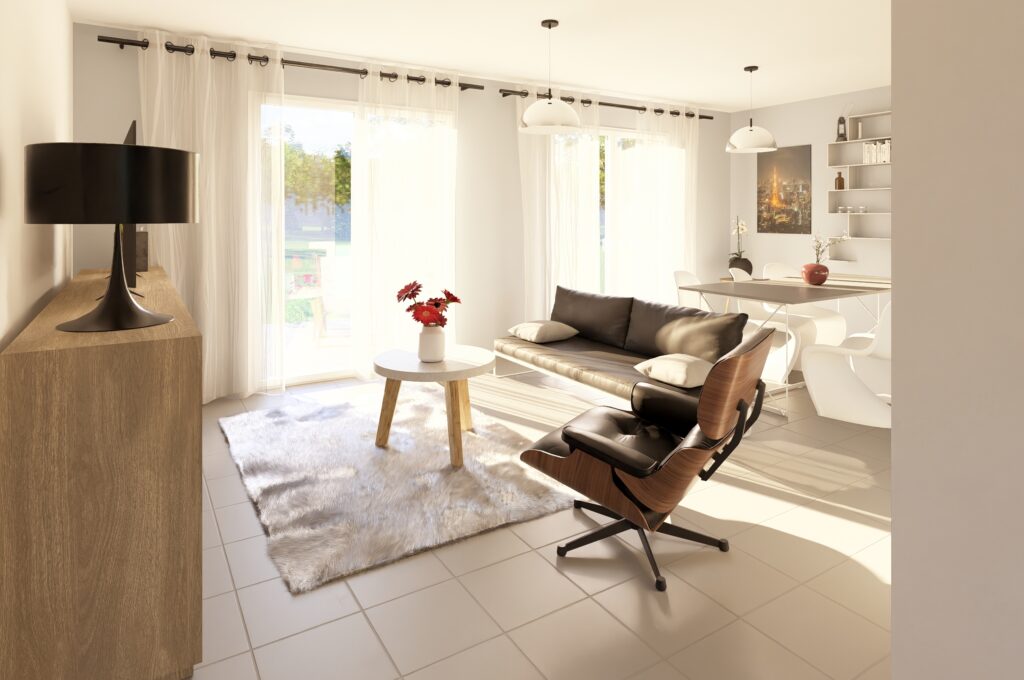 Le modèle 25134 – R+1 développe une surface habitable de 149 m², articulée sur deux niveaux pour répondre aux attentes d’une vie de famille confortable et organisée. Le rez-de-chaussée s’ouvre sur une grande pièce de vie traversante, associant séjour et cuisine dans un espace fluide et lumineux. Une pièce polyvalente y est également prévue, pouvant accueillir une chambre, un bureau ou une salle de jeux selon les besoins. Ce niveau comprend également un cellier attenant au séjour-cuisine pour faciliter le rangement, ainsi que deux WC indépendants. On peut également trouver une chambre avec une salle de bain privative qui vient s’ajouter à cet espace. À l’étage, le palier distribue trois chambres bien dimensionnées, chacune offrant un espace personnel agréable. Une salle d’eau fonctionnelle ainsi que des WC séparés viennent compléter l’étage pour assurer confort et praticité au quotidien. Un garage intégré vient parfaire ce modèle, apportant une solution utile pour le stationnement ou le stockage.