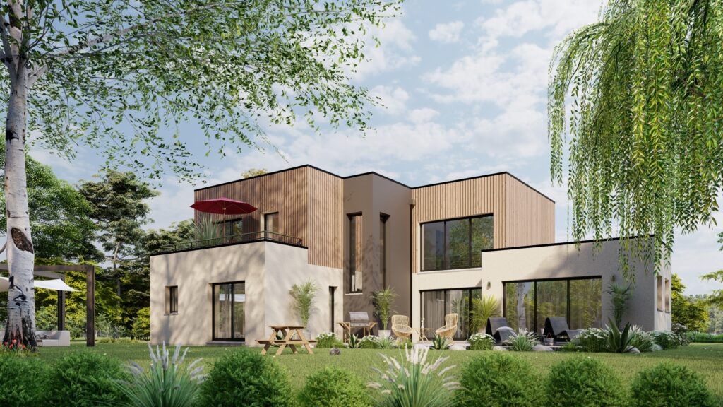 Avec une surface habitable de 216m², le modèle 25113 – R+1 offre des volumes généreux répartis sur deux niveaux, parfaitement adaptés à une vie de famille confortable et organisée.