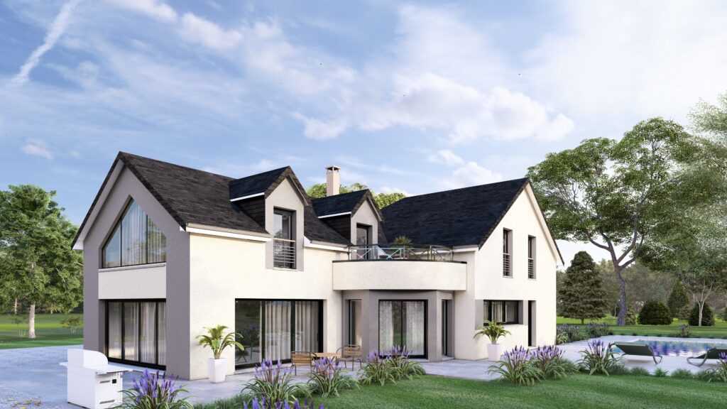Le modèle 2564 – R+C propose une maison spacieuse de 258m², répartie sur deux niveaux et pensée pour une vie familiale confortable et structurée. Son architecture sobre et élégante s’accompagne d’un agencement intérieur parfaitement équilibré. Le rez-de-chaussée accueille une grande pièce de vie lumineuse, où séjour et cuisine ouverte s’harmonisent pour créer un espace convivial, idéal au quotidien comme pour recevoir. Un cellier complète cet ensemble en facilitant le rangement. Ce niveau intègre également une chambre, un WC indépendant, ainsi qu’une salle de bain. L’étage regroupe trois chambres supplémentaires, un espace nuit conçu pour préserver l’intimité de chacun. Une salle d’eau fonctionnelle et des WC intégrés viennent compléter cet étage, pour un confort optimal. Cette maison sur mesure combine volume, fonctionnalité et prestations de qualité, pour répondre pleinement aux attentes d’une famille moderne.